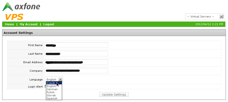 Požadovanou změna jazyka vašeho účtu pro správu VPS provedete jeho výberem z kontextové nabídky u položky "Language".