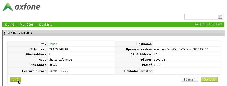 Příhlašte se do systému pro správu vašeho VPS serveru na adrese https://vm.axfone.eu . Přihlašovací údaje vám byly zaslány na kontaktní e-mail při aktivaci vašeho zákaznického účtu.